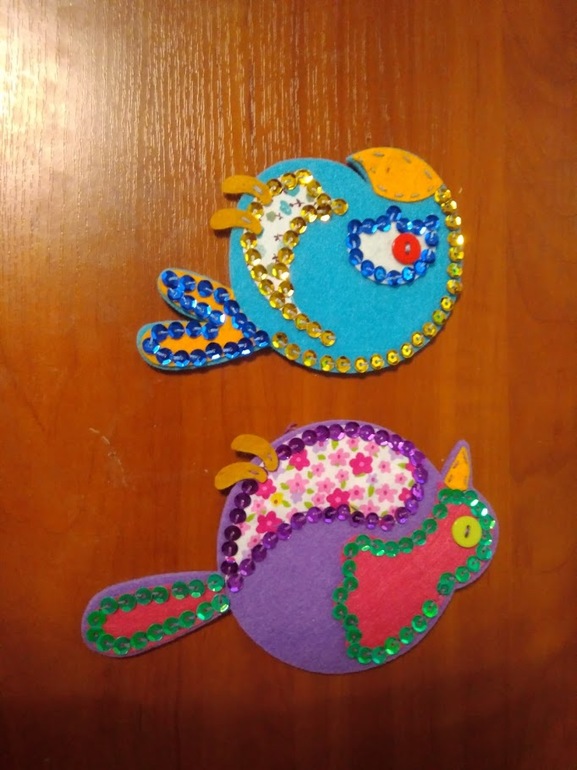 Первые 2 птички, пайетки пришивала уже мама, Вася старательно их подавала по одной штучке. Витя попробовал попришивать их, но ему быстро надоело.