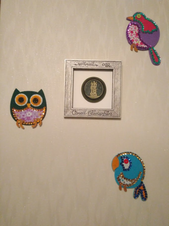 А это готовые работы мама повесила на стену для красоты. Сову шили с Васюнкой вчера, у Васи хватило терпения аж на оба глаза ну и на подавание пайеток, конечно :)