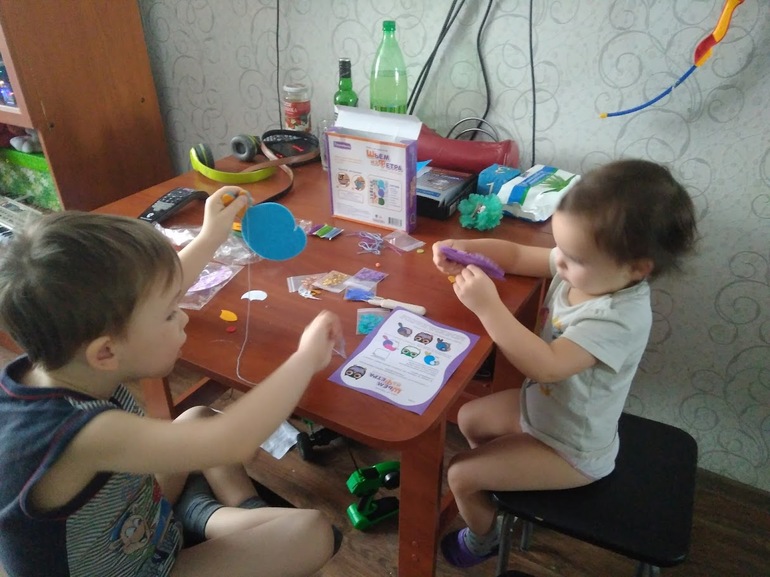 Дети увлеченно шьют, Вася только протягивает иголку и нитку, втыкает иголку с моей помощью, Витя делает стежки самостоятельно, пытался сам вдеть нитку в иголку, один раз у него даже получилось.