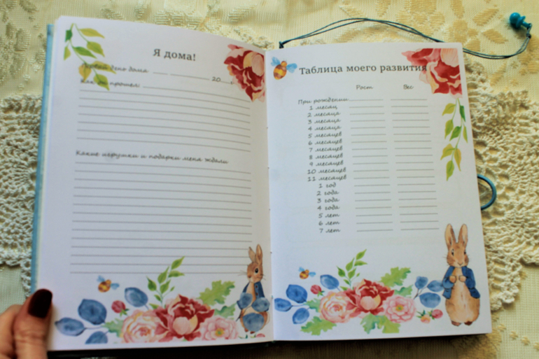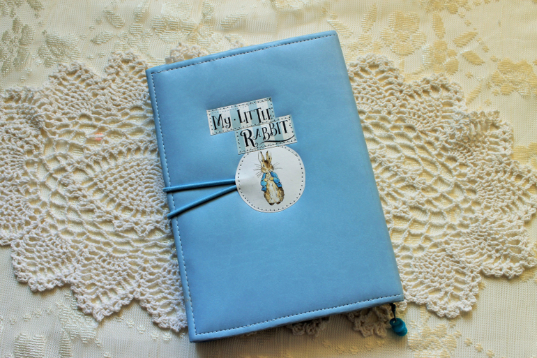 СкрапбукингКролик Питер - мой новый любимчик! милейшее создание! Давно хочу сделать с ним альбом, но руки дошли только до бебибука. Итак - дневник от рождения до 7 лет. Внутри 106 плотных страниц цветной печати, много всяких разделов - о беременности и родах, аллергии и болезнях малыша, конечно же есть график роста и веса, зубки, достижения и т.д. Обложка обтянута переплетным кожзамом, есть закладка из вощеного шнура с подвеской, закрывается на резиночку и пуговку