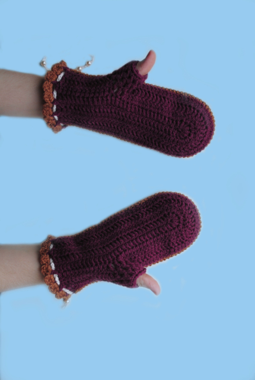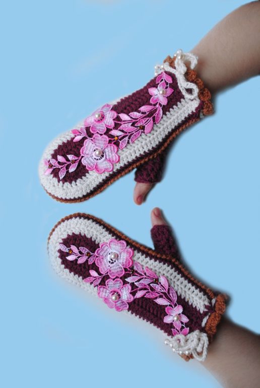 Связала ещё варежки, прямо драйв от процесса. Цветовую гамму взяла с коробки конфет Гейша, потому и назвала их так. Украшением стали бусинки и аппликации с вышитыми цветами.