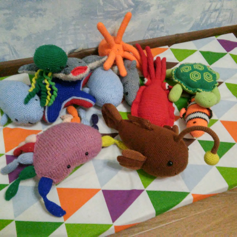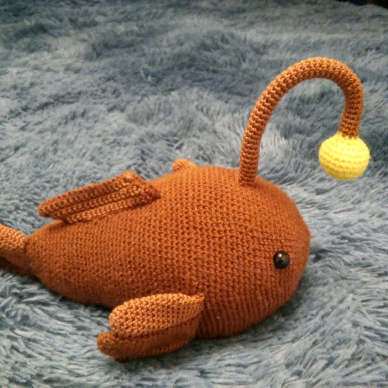Сын счастлив. А вот я не очень довольна. В первую очередь - выбором пряжи. Решила потихонечку избавляться от залежей акрила. Игрушки получаются очень мягкие, обнимательные. Но с о временем скатываются. У удильщика уже на носу появилась "ворсистость". А в эксплуатации он всего дней 10 :(.