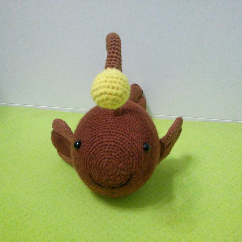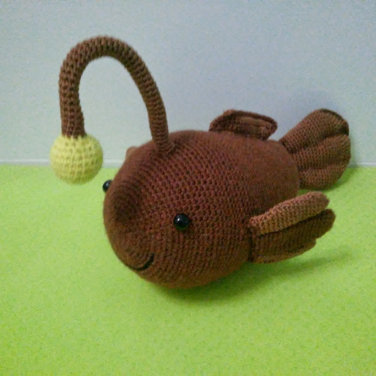 Амигуруми (вязаные игрушки)Полгода уговаривал меня сын связать для него удильщика. Основным условием было отсутствие челюсти и зубов. Удильщик должен быть большим, добрым и улыбчивым. Никакие объяснения, что удильщик без "оскала" это не удильщик -не принимались :)).