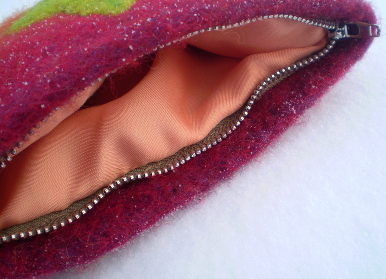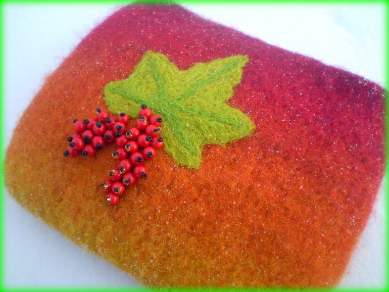 Вязание спицамиЕще один вязано-валяный клатч из Ровницы Кауни. Расход 85 гр, размеры 20 см х 17 см, спицы №5, закрывается на молнию. Связала большое полотно, затем валяла в машине при температуре 60 гр, в течение часа. Усадку клатч дал ровно в два раза , и по ширине и по длине. Зато получился очень плотный, даже твёрденький, толщина стенки 1 см, на ощупь как валенок))) Просушила, и уже по готовому клатчу набивала смородиновый листочек из той же Ровницы.