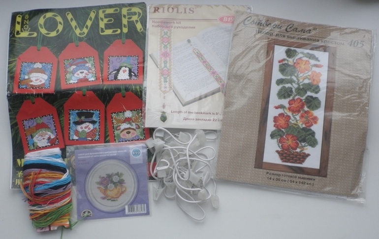 Остатки от наборов (схема+ остатки ниток):ёлочные игрушки, чайничек. Схема для плетения закладки (без бисера), Новый набор для вышивки "Сотвори сама" и боковая натяжка для вышивки на раме.