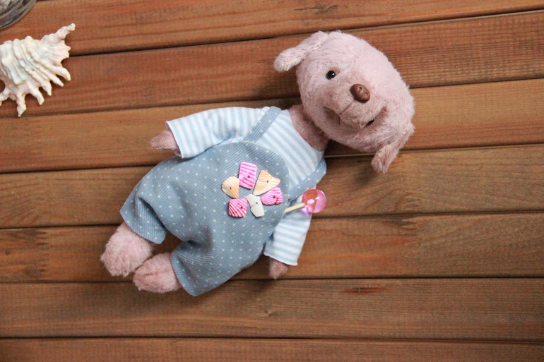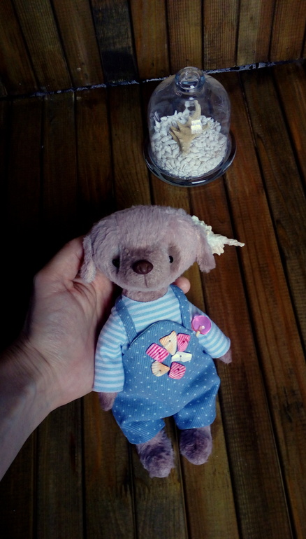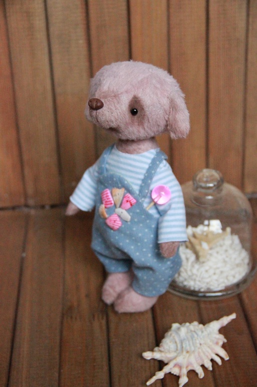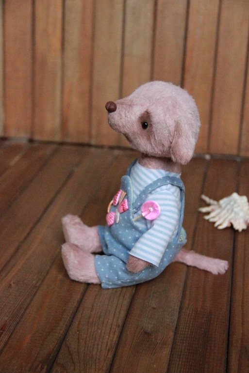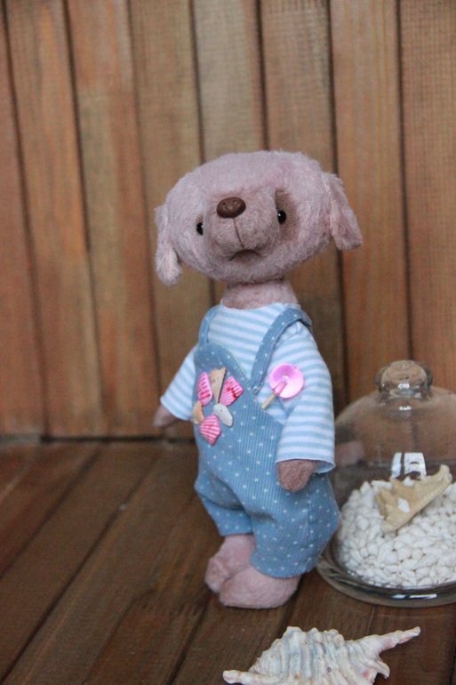 Собачка из вискозы, набита синтепухом. Пять шплинтов, голова и лапы подвижны. Утяжелена гранулятом, одежка съемная.