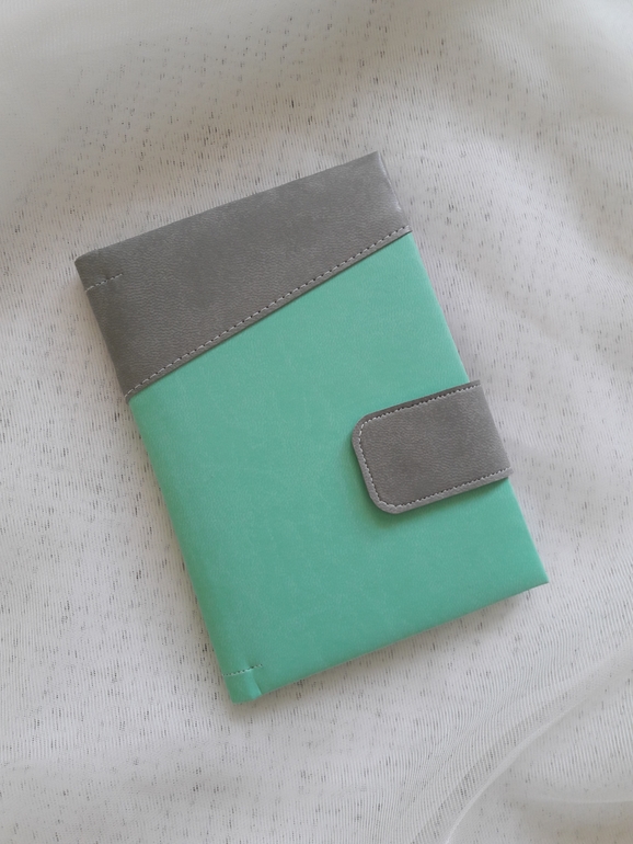 Выполнены из переплетного кожзама 2 цветов: мятного и серого. Застежка - хлястик на магните. Внутри кармашки из пластика.