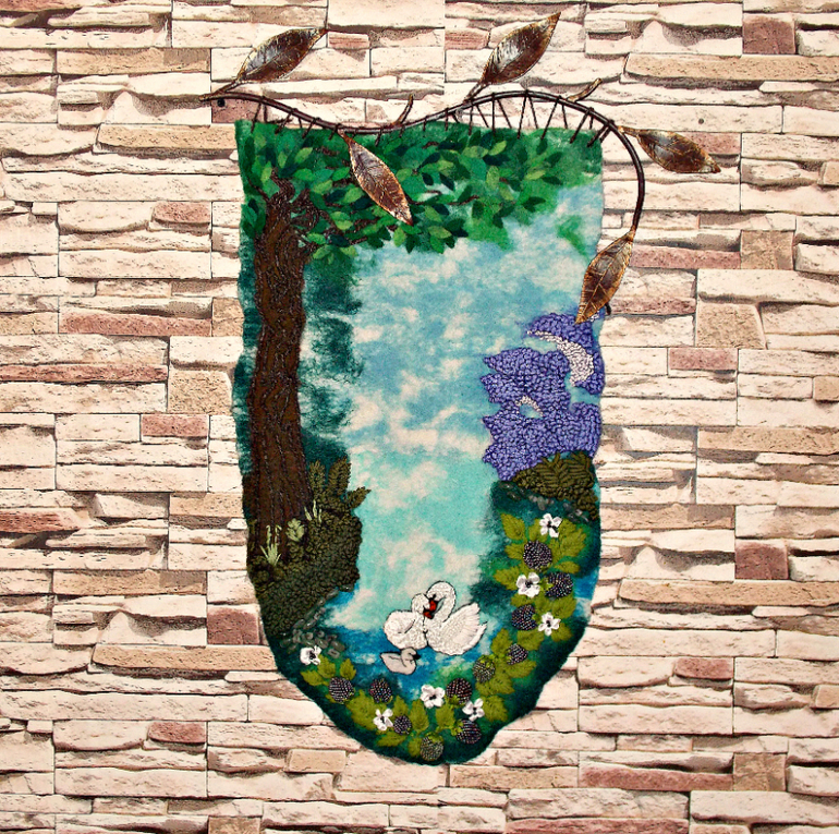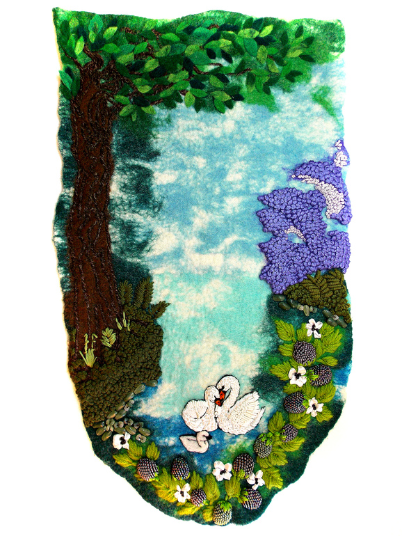 Панно еще не совсем завершено (муж должен выковать мне ветку, на которой оно будет крепиться) . Само панно сваляно по-мокрому, а рисунок сначала набит по-сухому и потом вышит. Нитки, бисер, бусины - все в ход пошло) Мох и сирень - французский узелок.