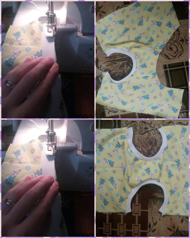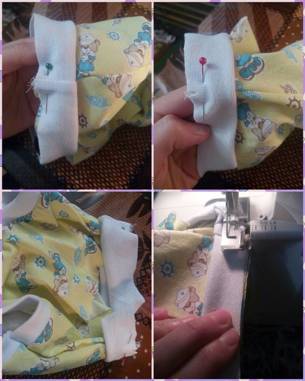 5. Пришиваем манжеты ножек, натягивая рибану до нужной длины (рибана вырезана короче, чем вырез для ноги для более плотного облегания. Во время носки растягивается.)