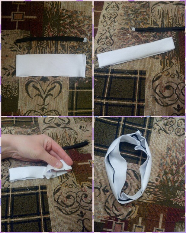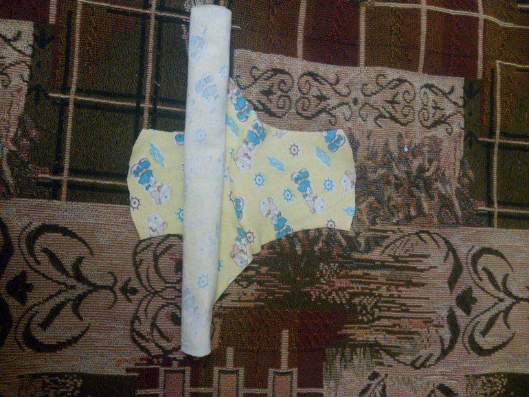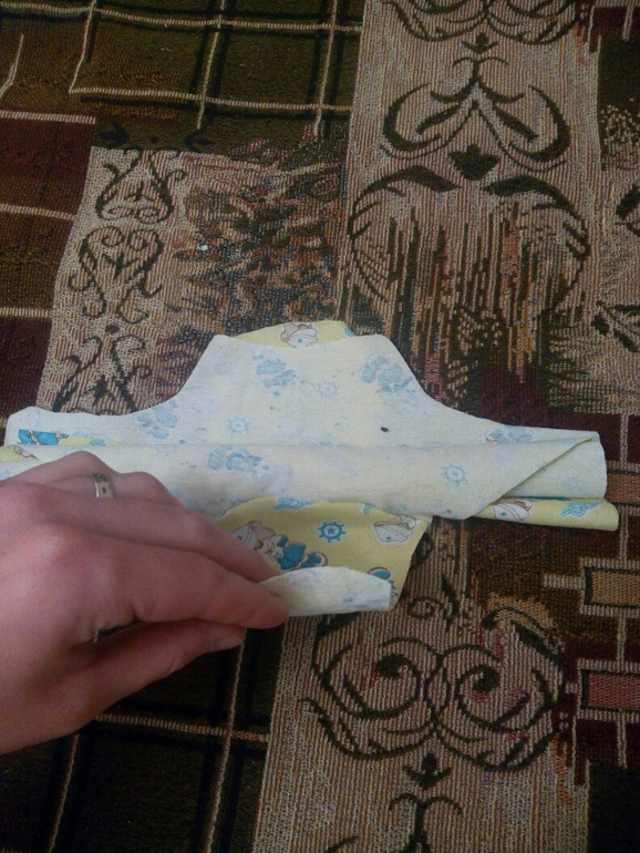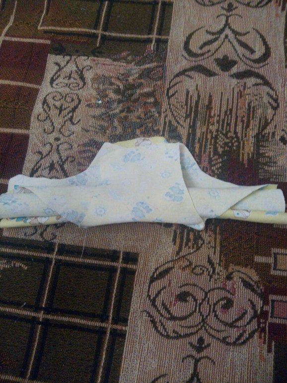 3. Расправляем ластовицы лицом вверх, а заднюю деталь скручиваем(по лицевой стороне, так что изнаночная сторона ткани смотрит вверх) и оставляем по центру между ластовиц.