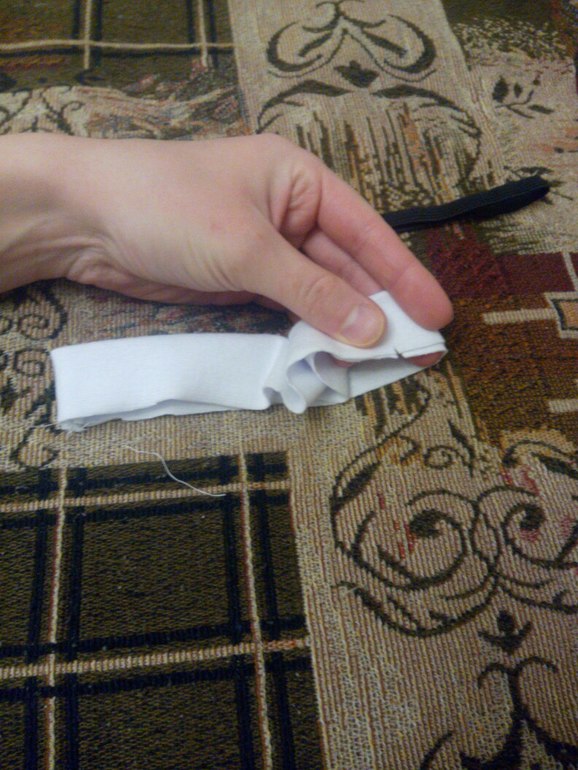 7. Прикалываем иголочками шов к шву, с другой стороны засечка к шву. Растягиваем рибану с резинкой и пришиваем к трусикам.