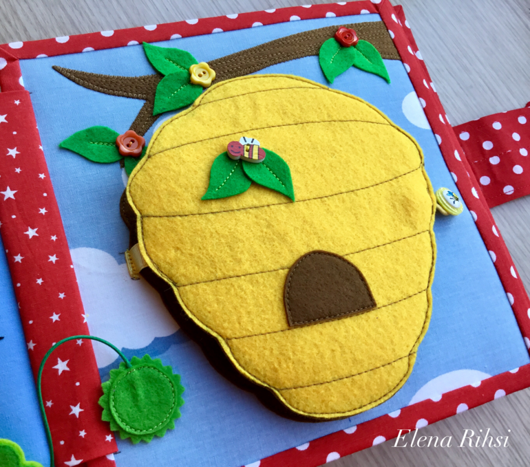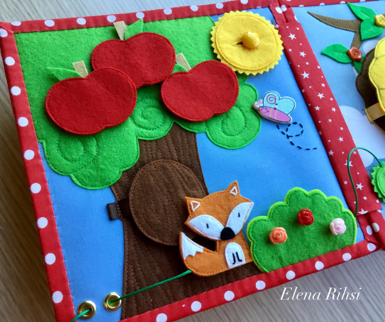 Страничка с лисичкой ( на перетяжке), которая прячется за розовым кустом. В дупле совушка. Красные яблочки держатся на липучках. Солнышко на пуговице.