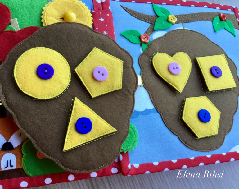 Малыш познакомится с основными геометрическими фигурами и здесь же ( по цвету пуговиц) - найди пару.