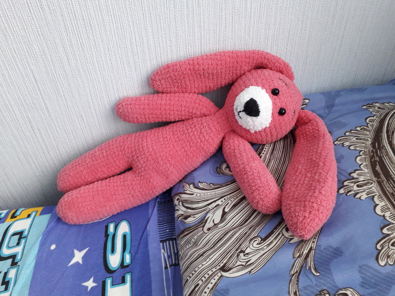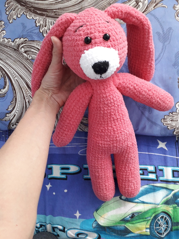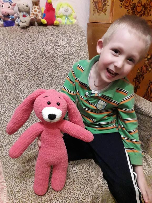 А как долго сын ждал его: "Мама, ну вяжи". И вот наконец когда я его связала, он обнял его и сказал: "Мне прямо хочется с ним спать". Так у сына появился новый пушистый друг :)