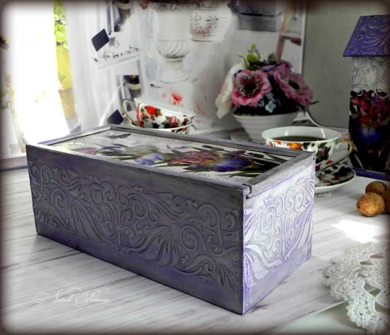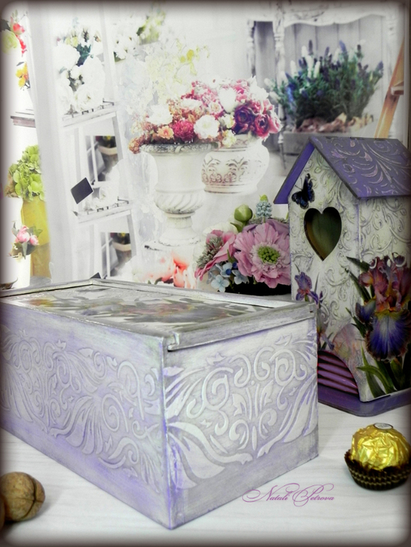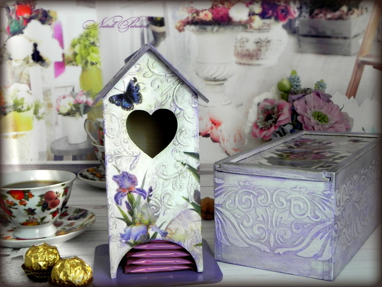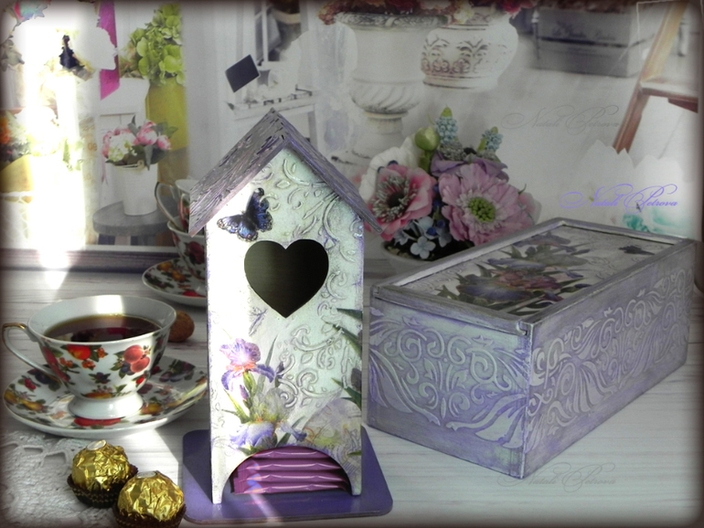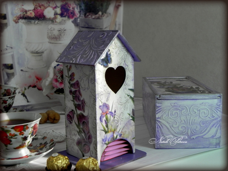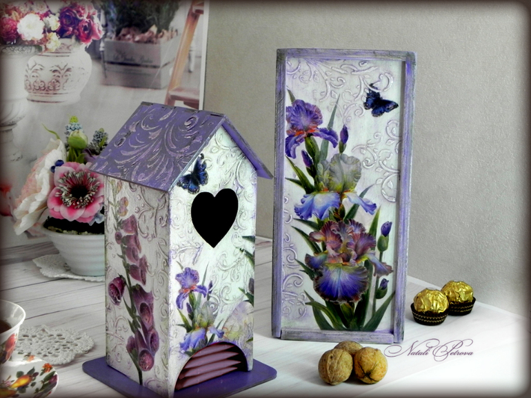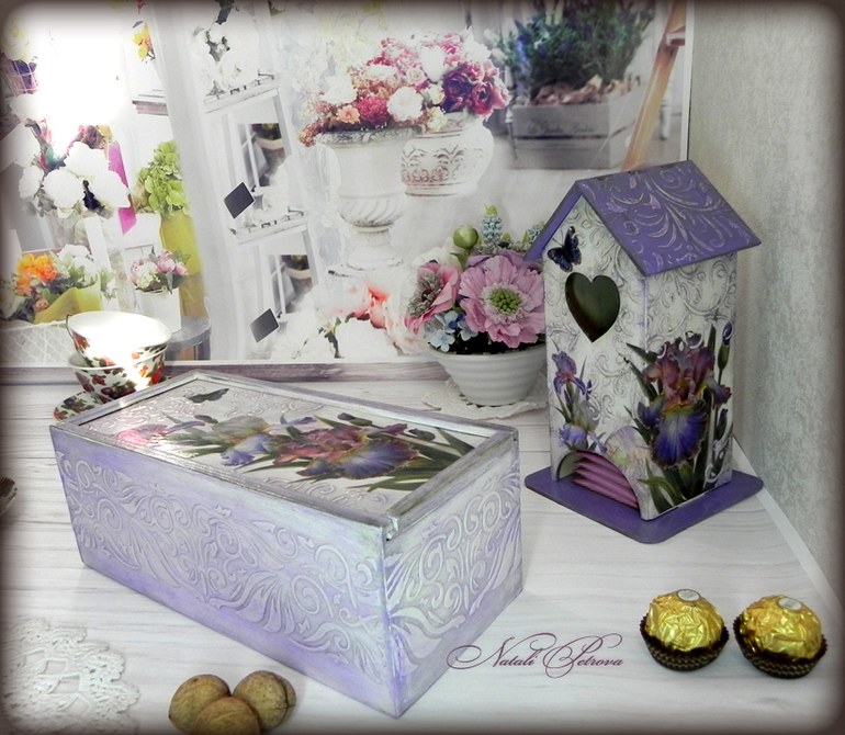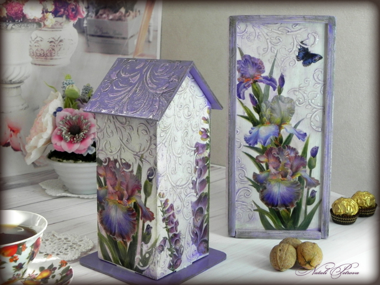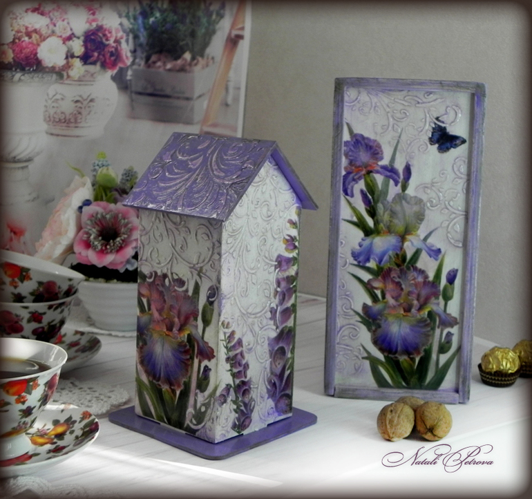 ДекупажИ снова я, и снова с чайным домиком, и снова с ирисами) Только теперь это комплект. В пару к чайному домику сотворился еще и пенал-короб.