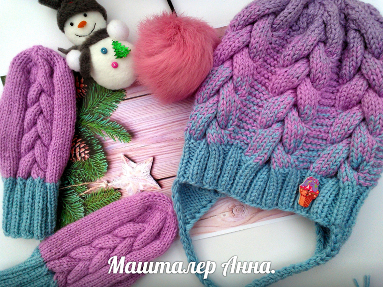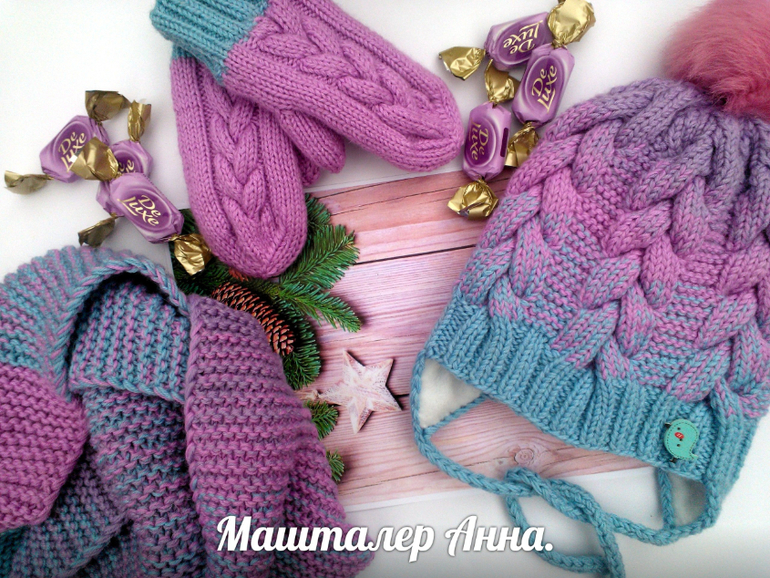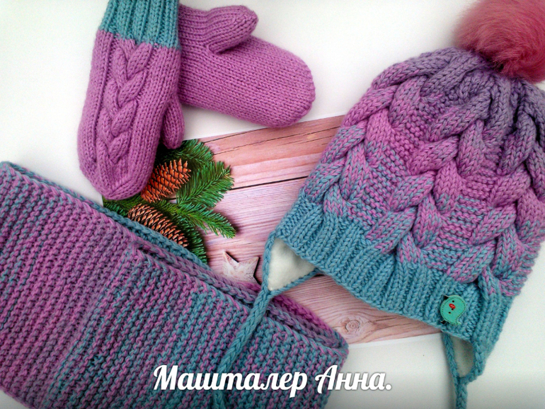 Вязание спицамиМой самый любимый комплект для девочки.Шапка с флисом узор коса с 15 петель и платочка,снуд в два оборота,и варежки.Вязала с детской полушерсти в три нитки и градиент с трех цветов.Помпон кролик.Под катом еще 2 фото