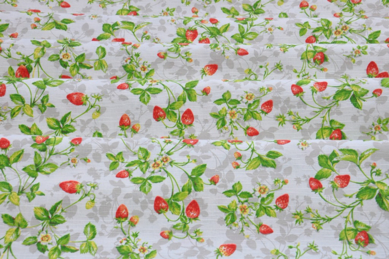 Ярко- красные ягодки в зеленых листьях, даже не зеленых, а смесь цветов: зеленый, желтый, салатовый. Белые цветочки и еще совсем не дозрелые ягодки с розовыми боками, которым осталось чуть- чуть дозреть. На белом фоне присутствуют тени маленьких кустиков земляники, что дает более насыщенный рисунок ткани.