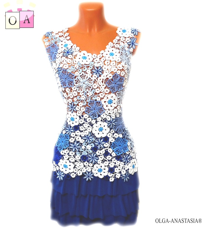 Вязание крючком (РАБОТЫ И СХЕМЫ)Ирландское кружево,авторская ручная работа- Топ "Гжель в подарок" На мотивы хлопок, крючок номер 1, сеточка- швейная нить, крючок 0,35.