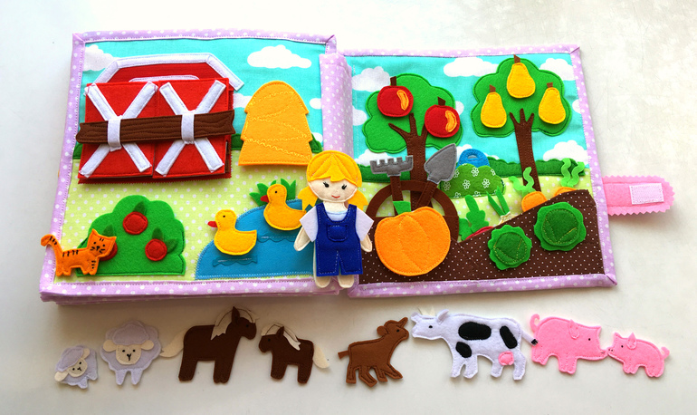 В книжке 9 страниц : спальня, ванная, кухня, ферма и огород, детская площадка.