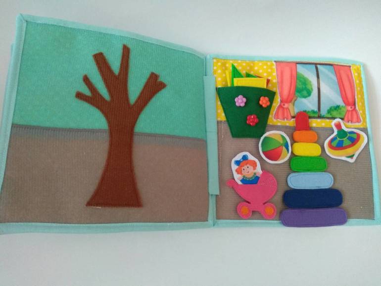 Страничка детская - в корзине игрушки: геометрические фигуры. Можно строить дома, башни на ковре (велкро).Пирамидка тоже на липучке