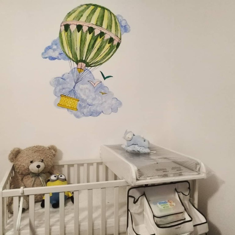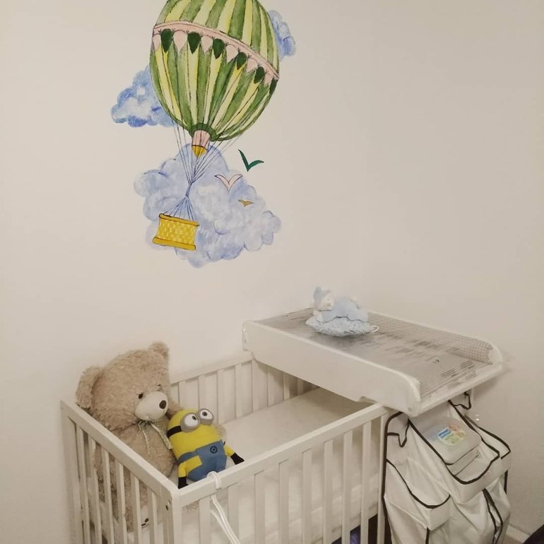 Живопись, точечная росписьДолго не знала как задекорировать пространство над кроваткой малыша. Так как у нас бортики в виде облачков, мне пришла в голову идея нарисовать воздушный шар 🤗 . А так как, нам подарили еще и комплект бортиков и постельного в зеленых тонах, то и шар мой тоже будет зеленым....барабанная дробь....