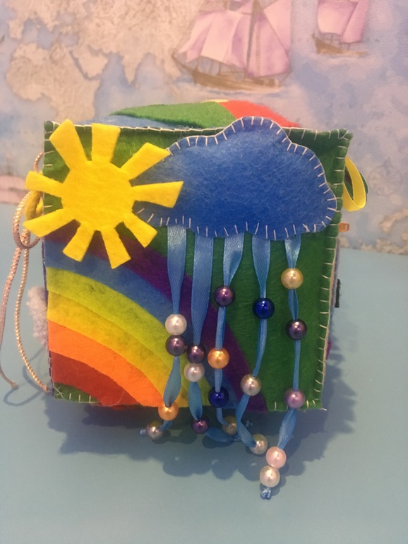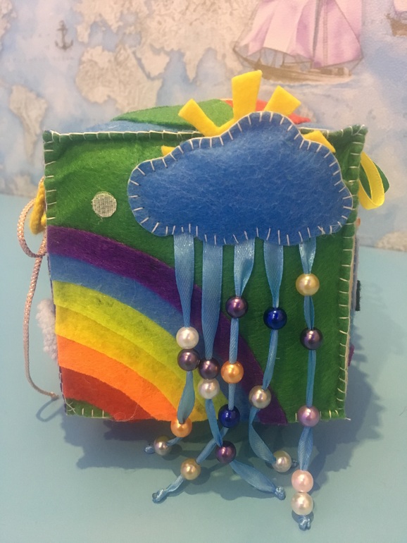 На 4 стороне радуга, по которой можно изучать цвета, "бусинки дождя" ( можно перетягивать, или учиться считать) и солнышко, которое то выглядывает из-за тучки, то сново прячется ( крепиться на липучке)