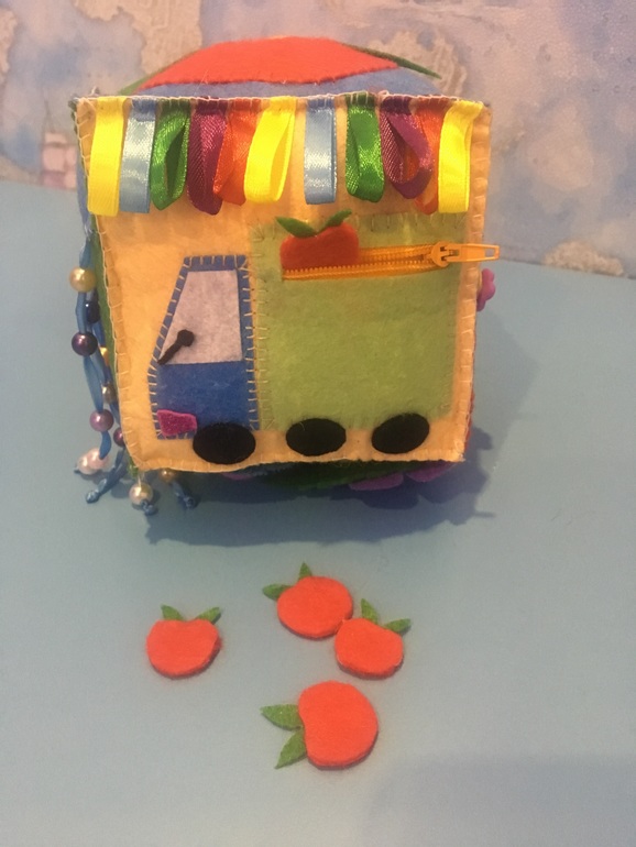 На 1 стороне вот такой грузовичок, его кузов на молнии и в нем он перевозит яблочки.