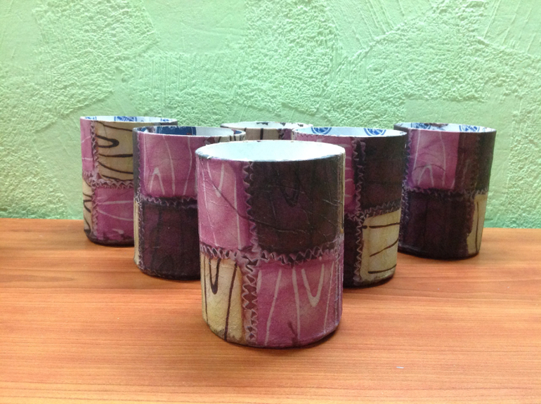Первые 2 я сделала из 1 бабинки (не склеивала по две а просто два низких стаканчика получилось) в них у нас стоят коротенькие/сточенные карандашики и маленькие фломики:) и эти два стаканчика тогда еще не додумалась салфеткой обклеить, а использовала скотч красивый, он тоненький но с узорами, сверху обклеила одним слоем прозрачным скотчем :) года 1,5 пользуемся уже все стаканы целы :))