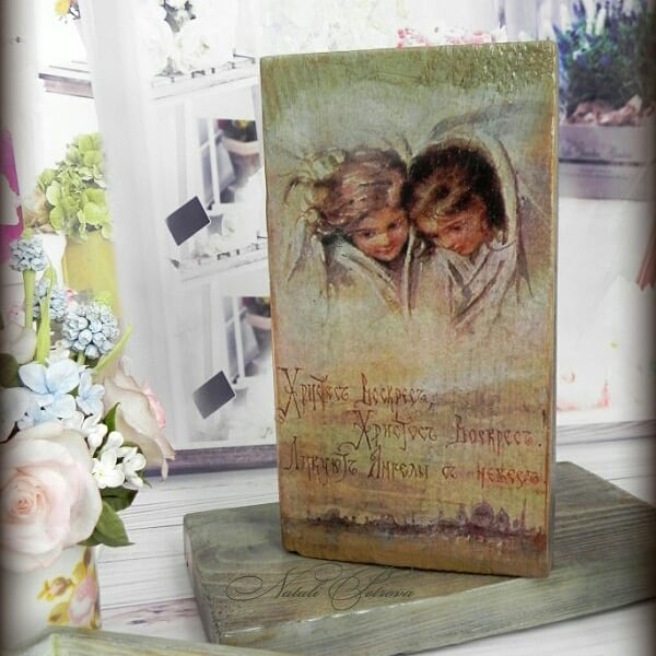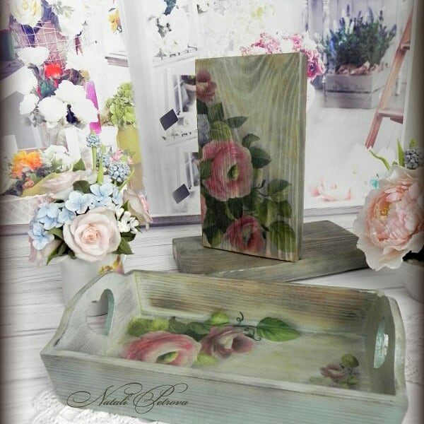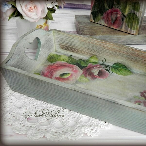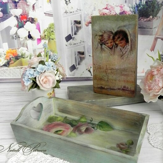 ДекупажБывает у меня такое, что работа никак не получается. Мучаешь ее неделями, думаешь, а она не нравиться и всё. А потом осеняет или вдохновение приходит и буквально через час она готова. Так было у меня с предыдущим набором.