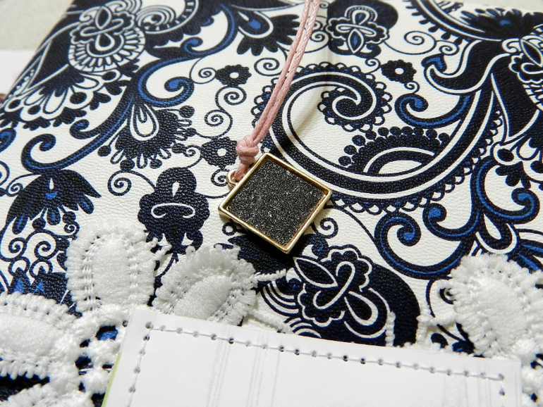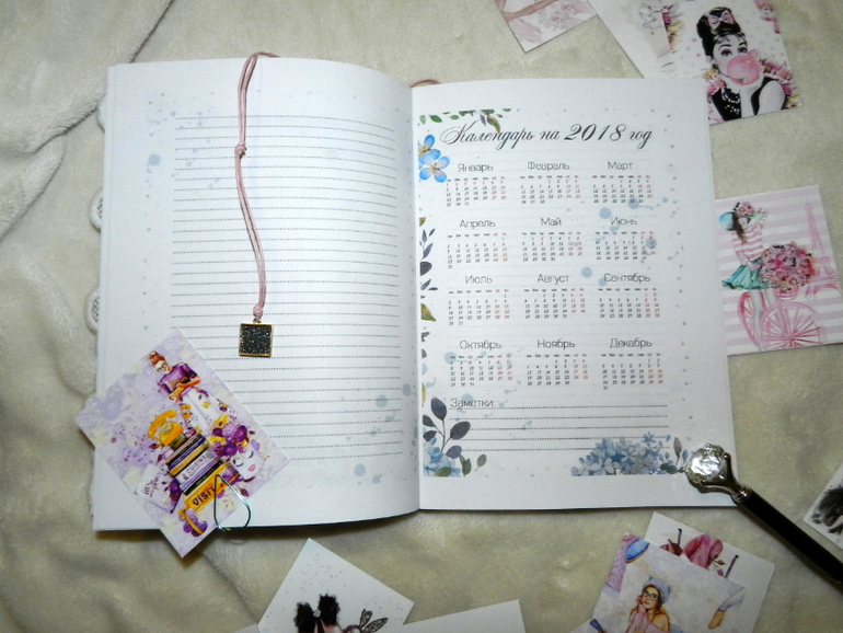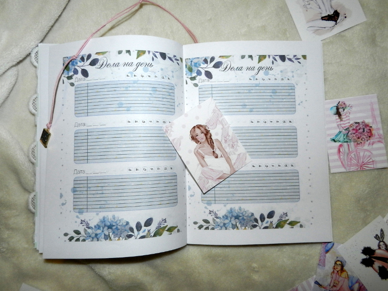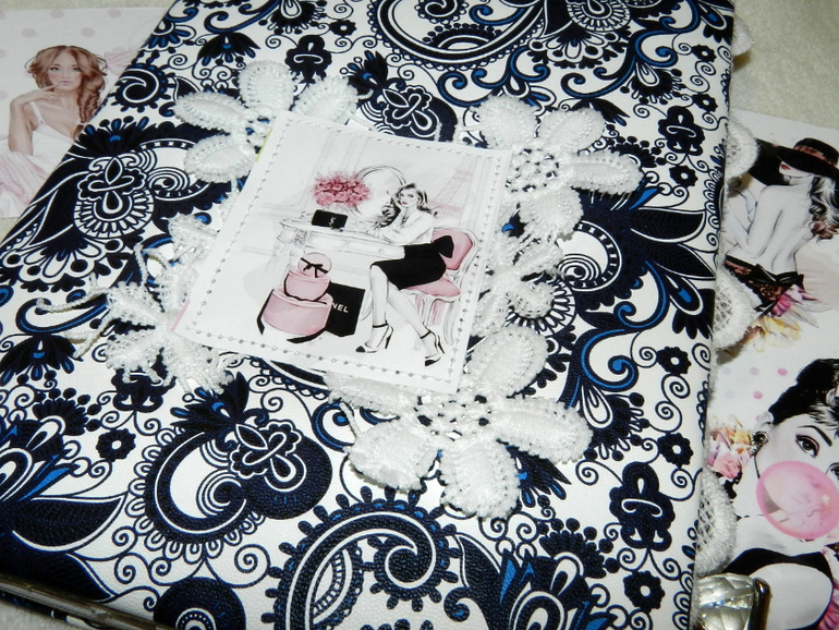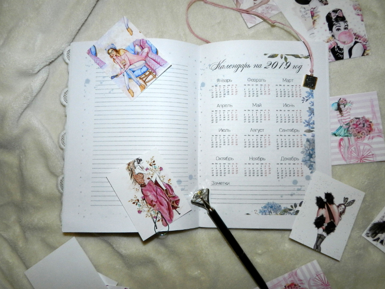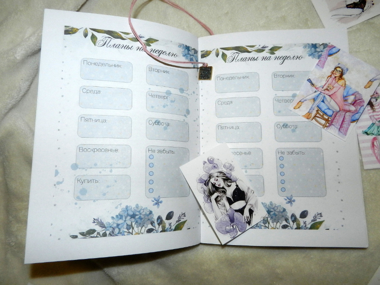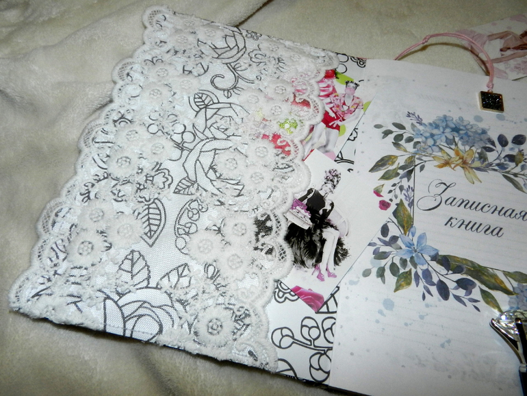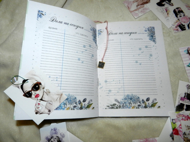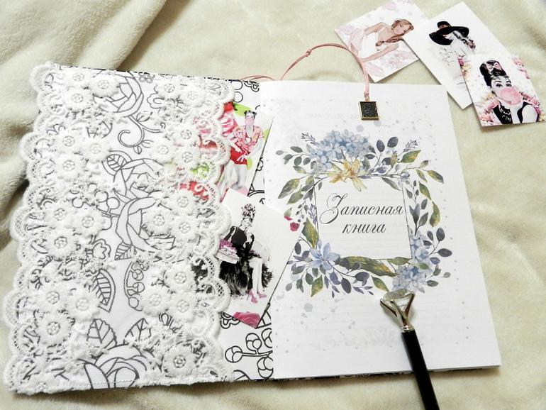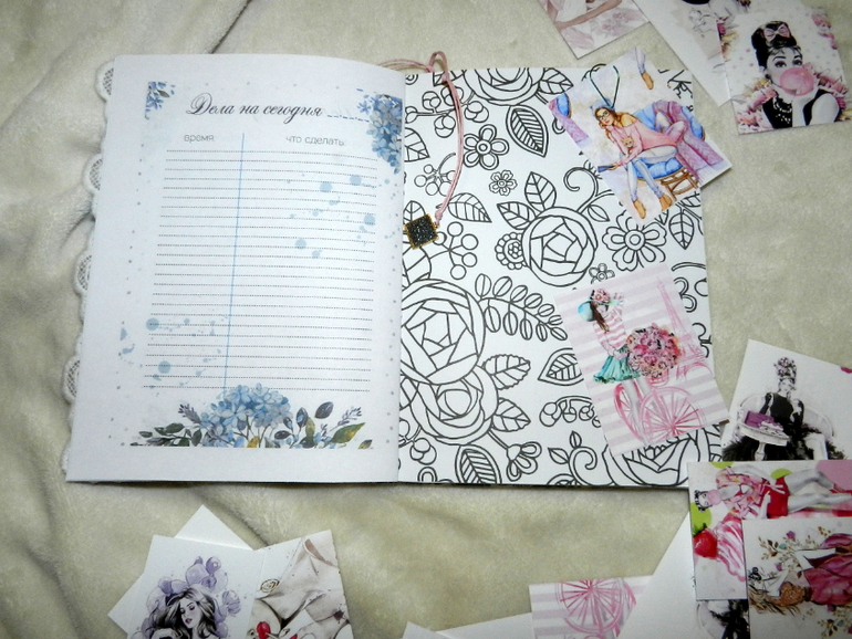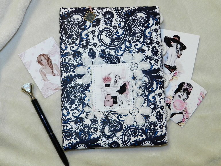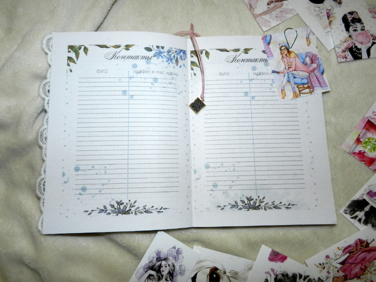 Обложка и безумно мягкого кожзама+кружево, и картинка Леди! А на форзаце-кружевной карман, кружево, выглядывающее из под кожи...подвесочка...и куча картинок закладок-как напоминание того, что прежде всего мы Девочки!!!! Ну и странички-чтобы все записать и все успеть!
