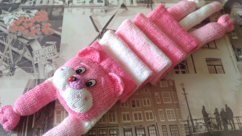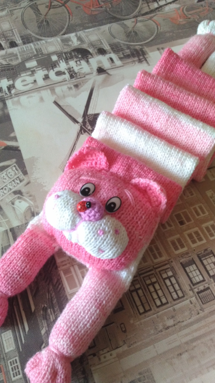 Длина шарфика получилась 100 см без учета лапок.Ширина 15 см.Вязала в подарок на годовасие племяннице.