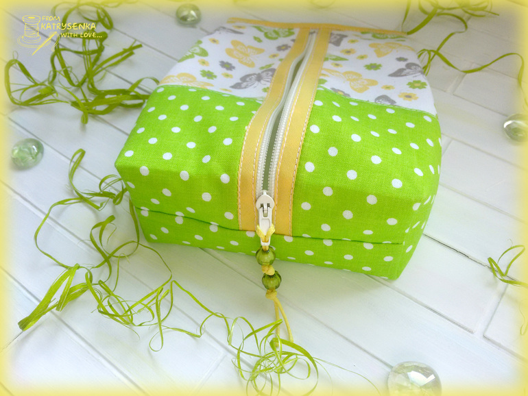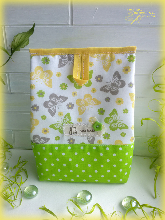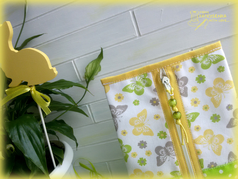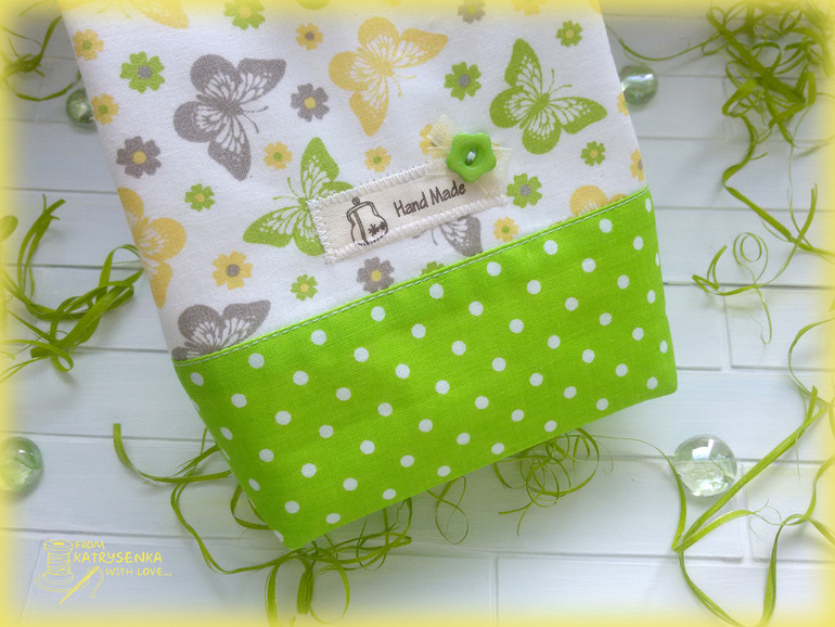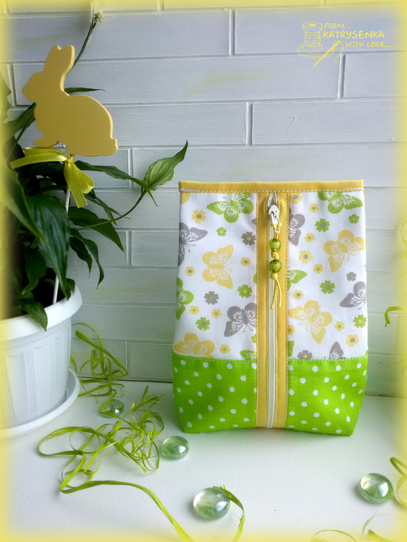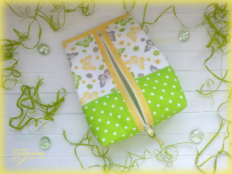 Сшита косметичка из американского хлопка с бабочками и корейского хлопка в горошек, в качестве окантовки использовала хлопковую косую беечку. Все детальки верха продублированы тканевым дублирином - косметичка приятно плотненькая и держит форму.