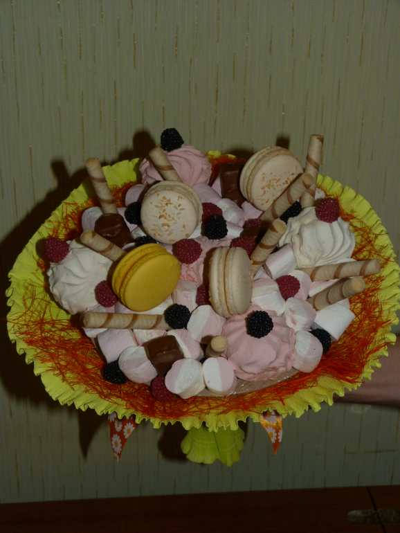 Букеты из конфет. Свитдизайн.У доченьки скоро день рождения, решила сделать для неё букет. Из конфет и фруктов уже делала, а такой - впервые. Результатом довольна, использовала : большой зефир, маленькие зефирки, шоколадные конфеты, вафельные трубочки, печенье Макаронс и, для декора, мармелад - ягодки. Под катом 2 фото.