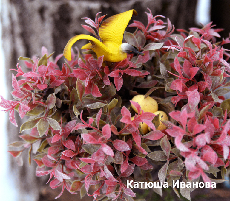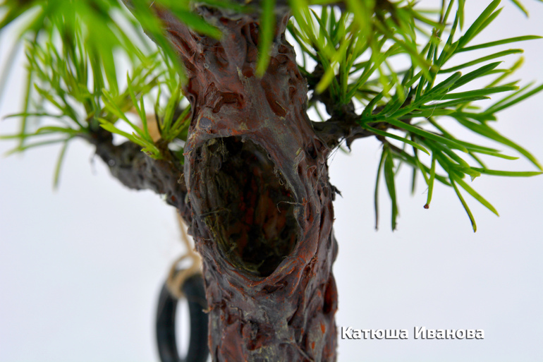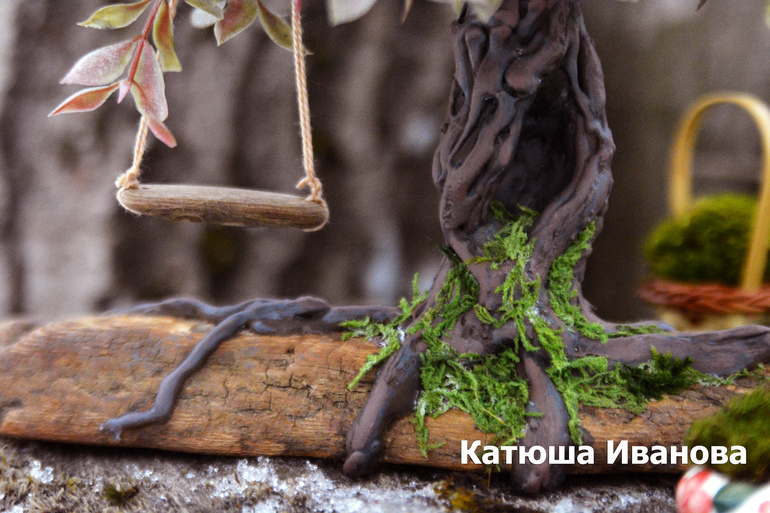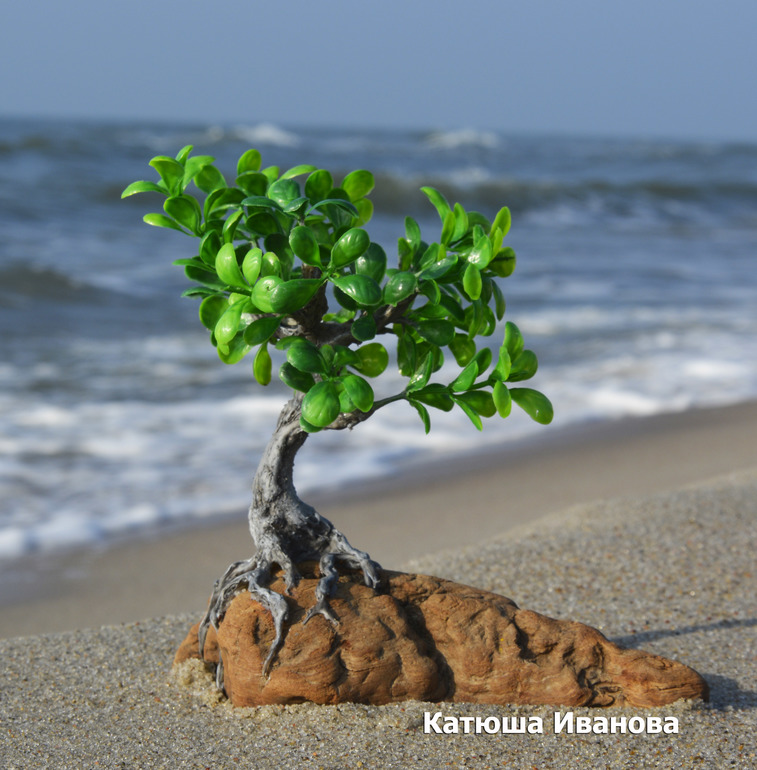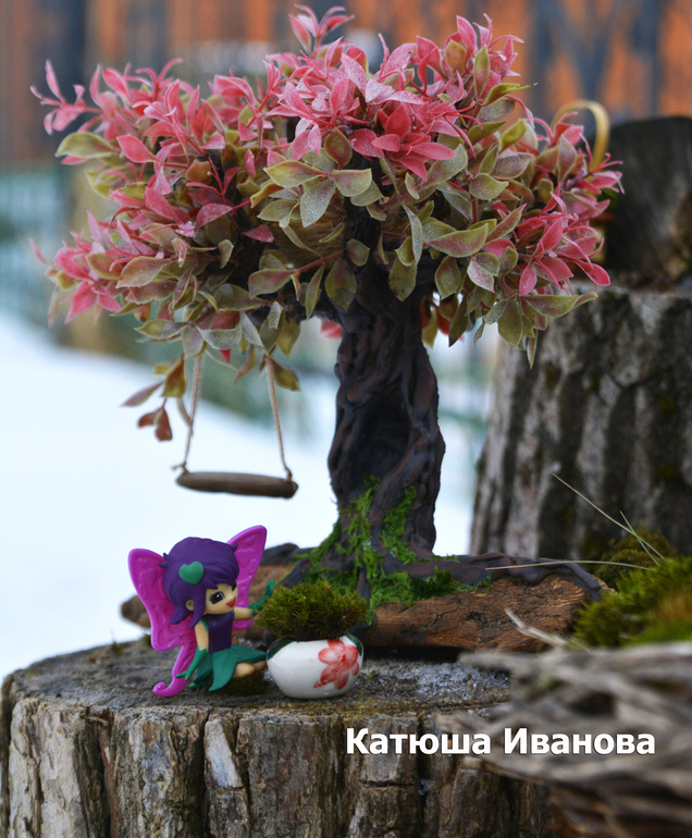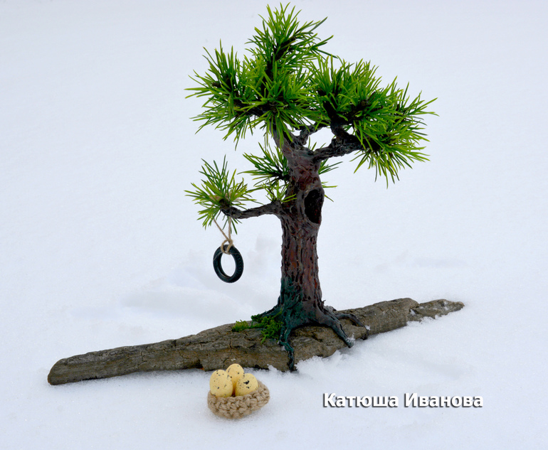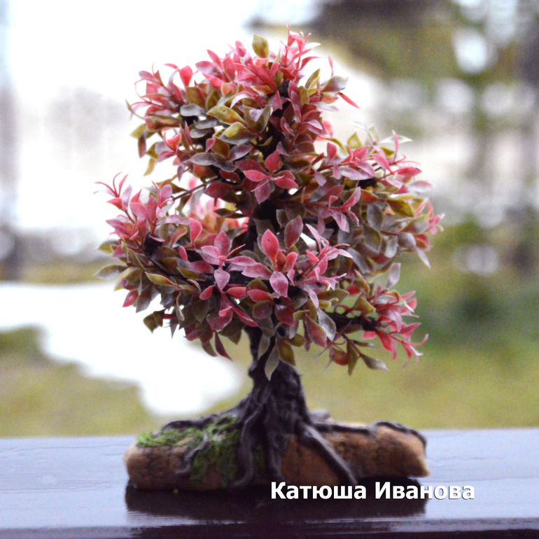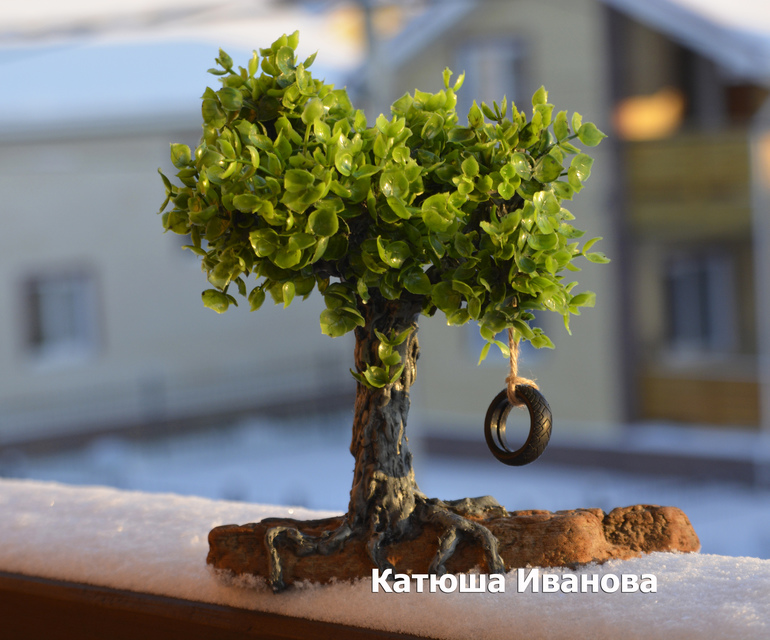 Это игрушечное деревце, сделанное мной из проволоки, горячего клея, искусственных листьев и куска деревяшки, найденного на берегу Волги. Многие, когда видят мои деревья не верят, что их можно сделать вот так, дома, сидя за столом с проволокой в руках и попивая кофе. Я же получаю от своей работы неописуемое удовольствие, потому что в моих руках рождается волшебство.