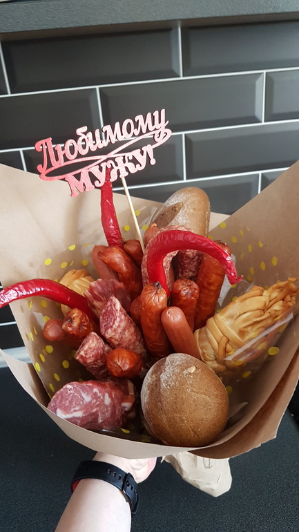 крутой букет! я вот искала кто бы сделал такой на 23 февраля-самой чет так лень было ездить искать колбасу и тд)))