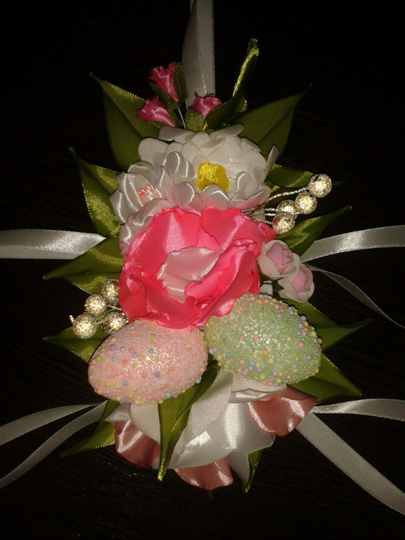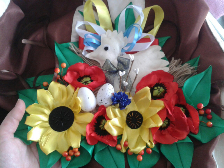 Цветочки делала из атласных лент,немного готового декора и текстильные зайки и курочки)