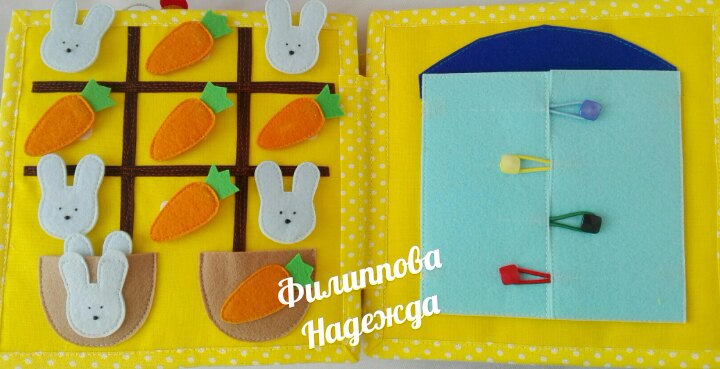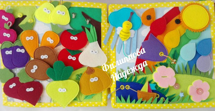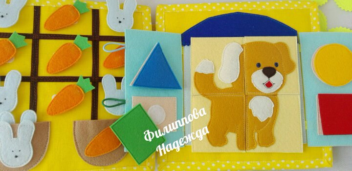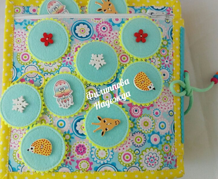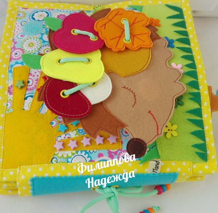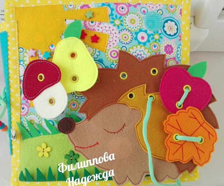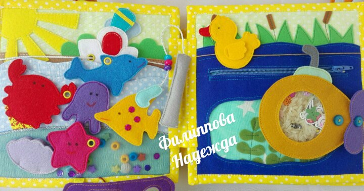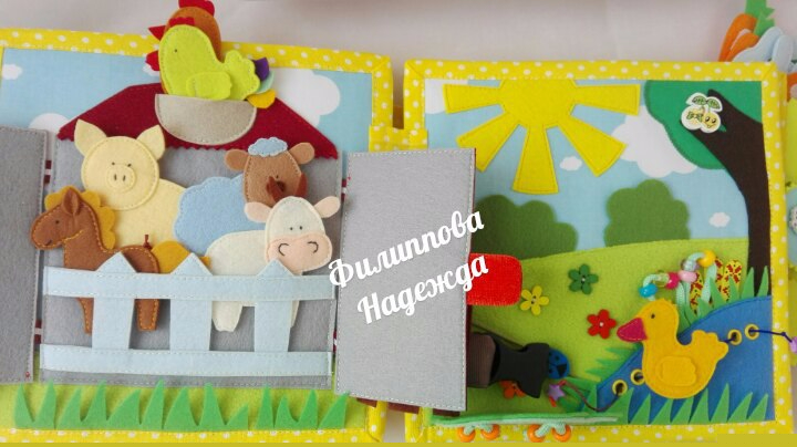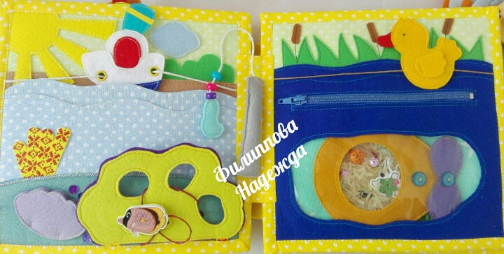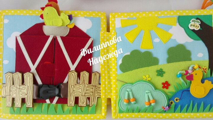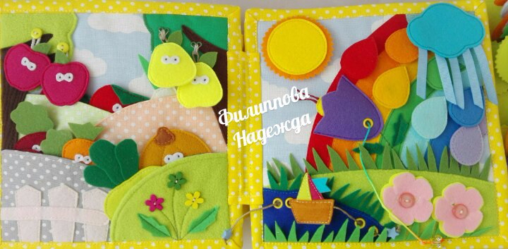 1 - на обложке ежик-шнуровка в погремушкой внутри) с помощью шнуровки помогаем ежику собрать запасы. На солнышке тактильный счет до 5, изучение цвета. 2 -огород. В грядках растут различные овощи, на деревьях яблоки на навесной петле и груши на крючке. 3 - радуга с капельками на кнопках. Сортер по цвету, тучка и солнце на липучке, цветы на пуговицах. Кораблик на перетяжке плавает вправо-влево (изучаем направление), пчелка на перетяжке.Если потянуть шнур, она прячется в цветок! 4-5- разворот с фермой. Можно разыгрывать ролевые игры, изучать звукоподражание ( кто как говорит, кто что ест...) 6 - магнитная рыбалка отлично развивает координацию! Ловим морских жителей в волнах, проговариваем их названия. Кораблик плавает вправо-влево, в ракушке прячется жемчужинка. На дне сенсорная панелька для массажа пальчиков. В кораллах плавает рыбка - свободная шнуровка. 7- домик с пазлом. Домик закрывается на пуговки навесными петлями. Внутри пазл на липучке! Так же на внутренней части дверей геометрический сортер. Изучаем геометрические фигуры и цвет. 8 - на последней страничке кармашек на молнии. Внутри карточки мемори, тренируем внимание, память)))