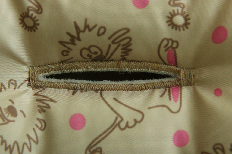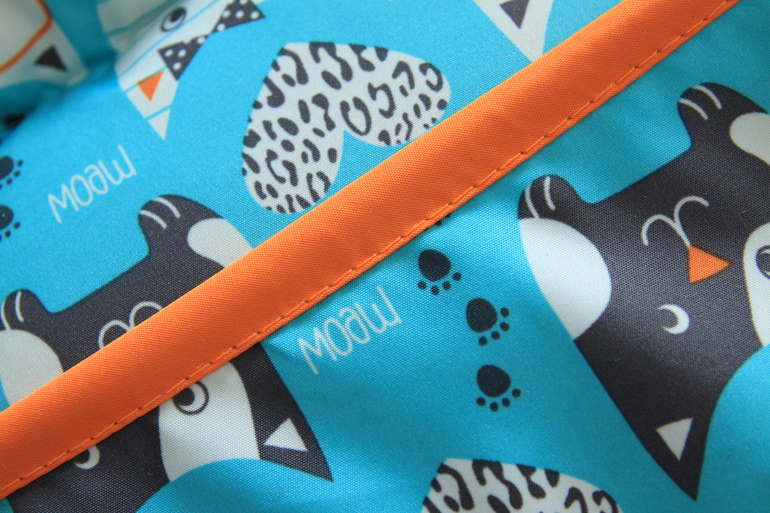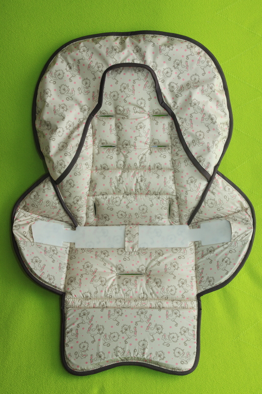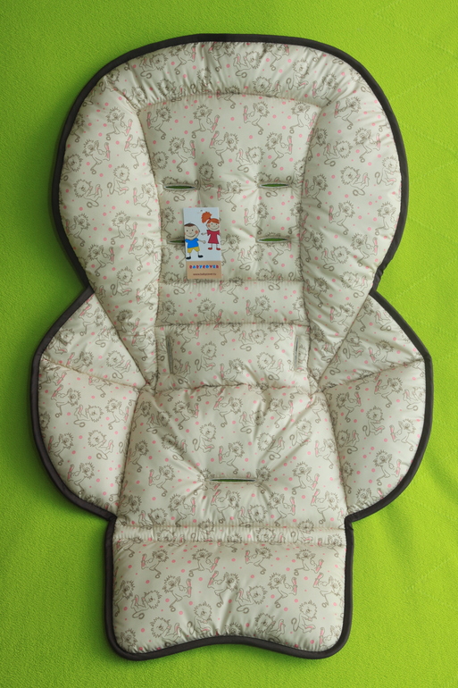 3. Чехол на стульчик для кормления Brevi B Fun. Принтованная плащёвая ткань с водонепроницаемым полимерным покрытием внутри, наполнитель - холлофайбер плотностью 500 гр., все прорези под ремни и отстрочки выполнены, жёсткие пластиковые вставки в нижней части чехла и в боковинках присутствуют. Поперечная пластиковая вставка съёмная.