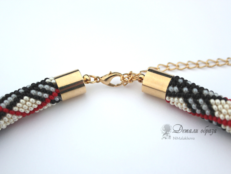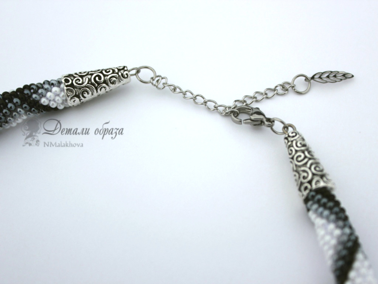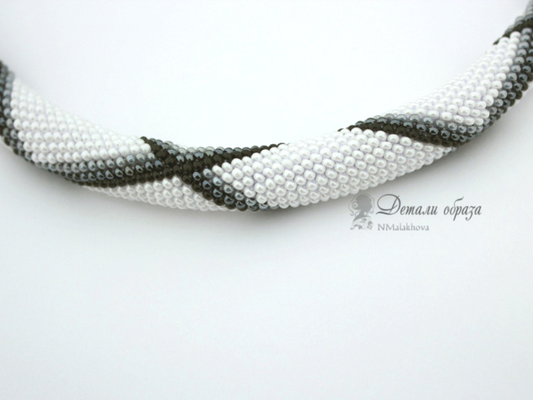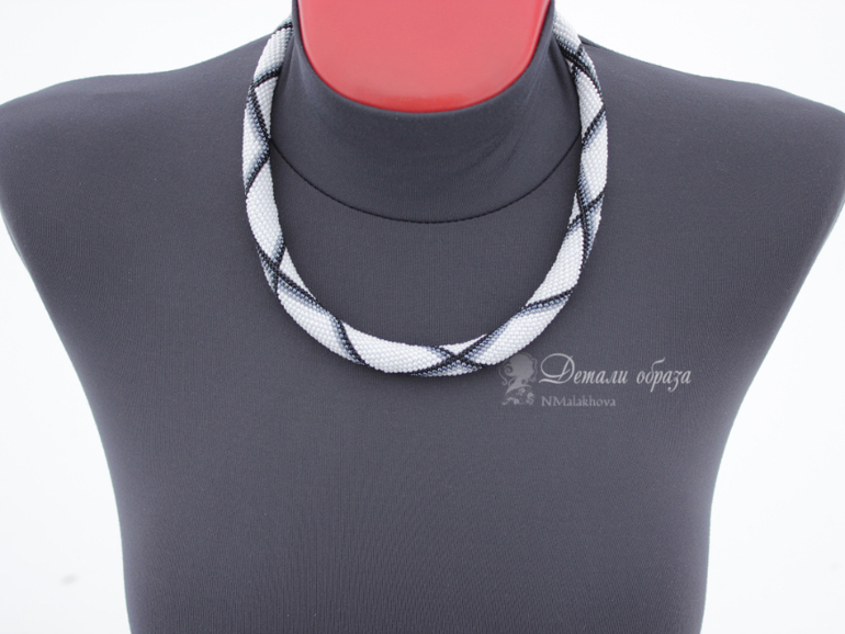 Жгут исполнен в технике вязания крючком с бисером. Строгий рисунок пересекающихся градиентных лент в универсальном черно-белом цветовом решении.