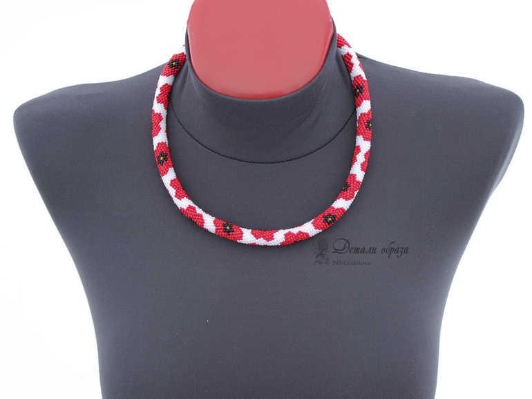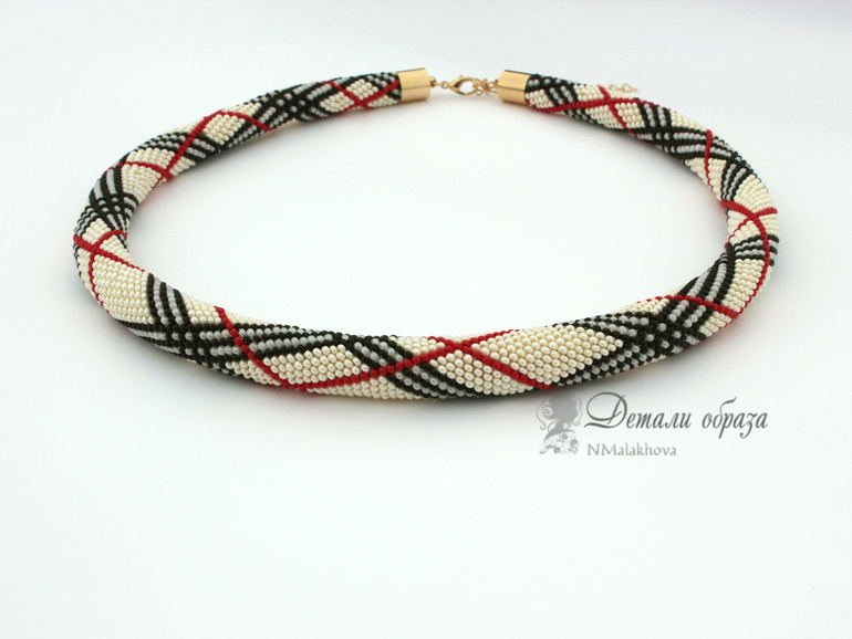 Жгут исполнен в технике вязания крючком с бисером. Классическая клетка Burberry в диагональной интерпретации.