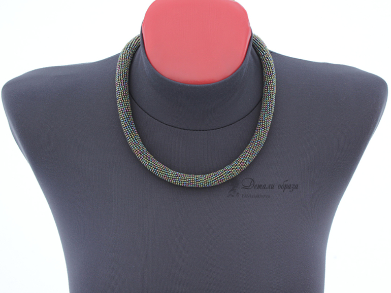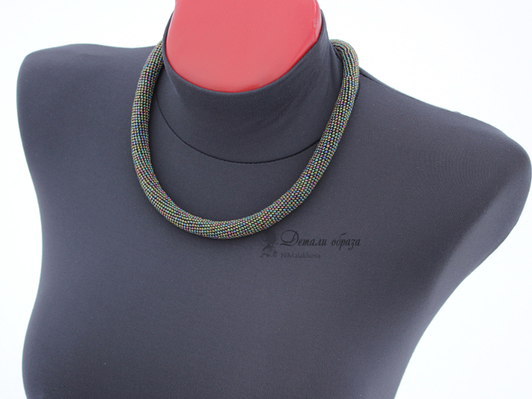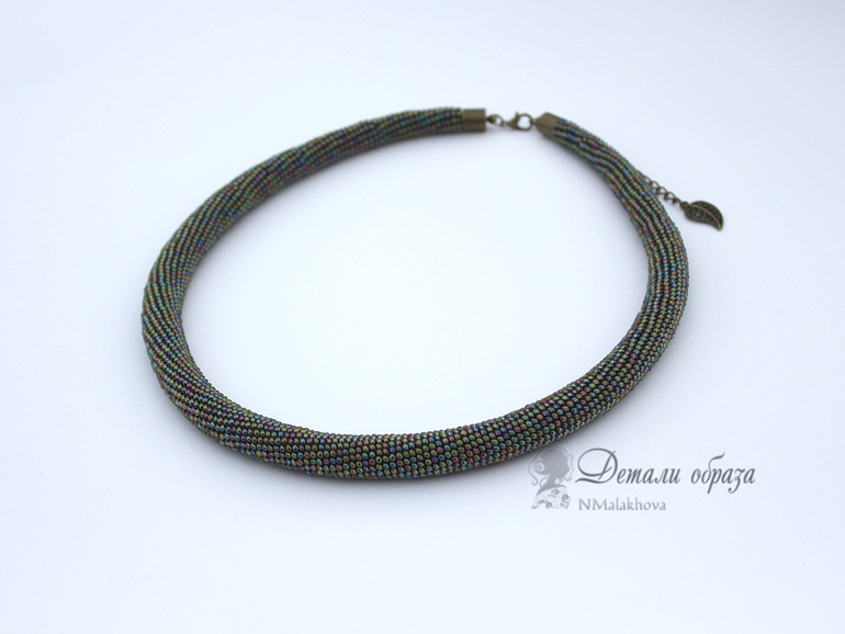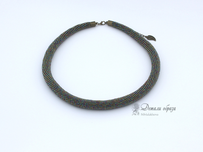 Жгут выполнен в технике вязания крючком с бисером. Желто-зеленый "бензиновый" бисер играет множеством оттенков при дневном и искусственном освещении.