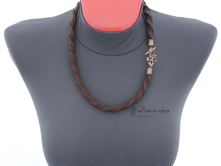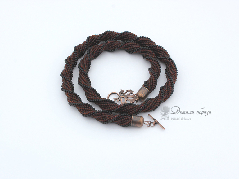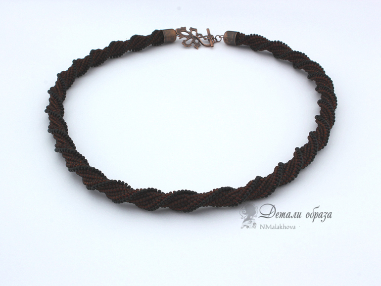 Жгут выполнен в технике вязания крючком с бисером. Матовая коричневая спираль напоминает виноградную лозу, застежка - словно засохший лист.