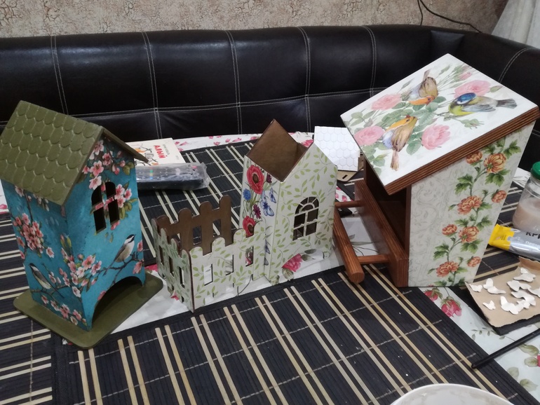 Спасибо, Катюша! Кормушка на дачу поедет, повесим на березу или баню. А бабочки-это сюжеты из салфетки, с ПВА нанесенные на раскатанную самозатвердевающую глину, вырезанные ножом и немного поджатые по краям, для придания им объёма. Они на домик с забором потом перекачуют.