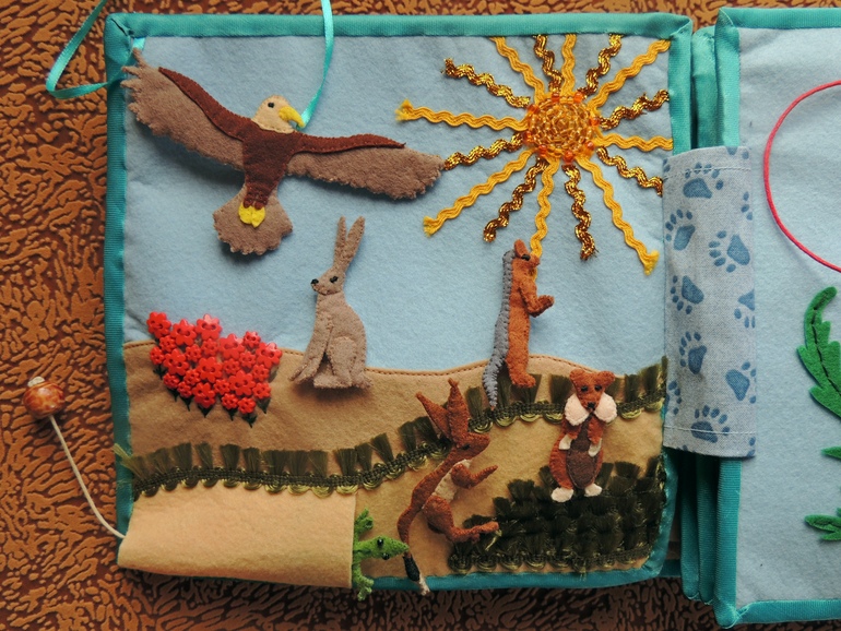 Первая остановка - пустыня. На одной странице палит жаркое бисерное солнышко, цветут красные маки и живут степные звери на липучках, а в норке прячется маленькая ящерка которую можно вытаскивать. На другой странице расцвел степной мак и на него села пчелка. В 1,5 года ребенку очень понравилось закрывать цветок.