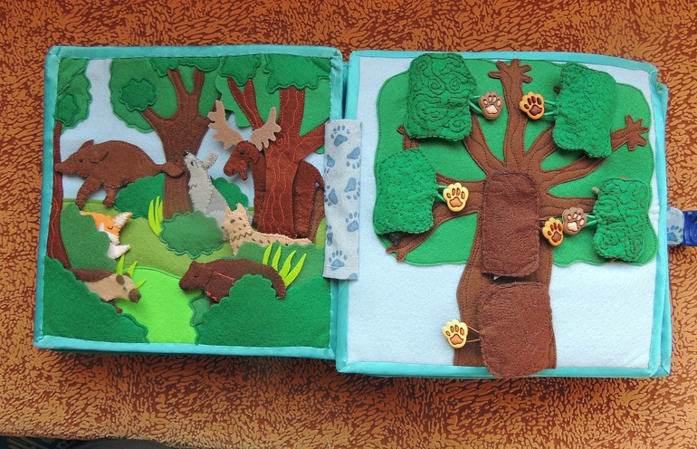 Дальше нас ждет лес. Лесные обитатели спрятаны (и не очень) в кармашках, а на дереве в дуплах и ветвях живут птицы и белка (сьемные - на липучках).