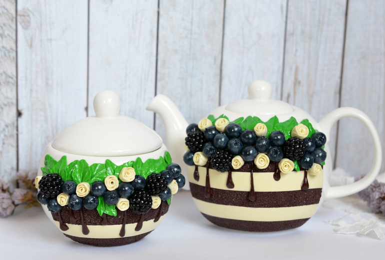 Лепка из пластики (полимерная глина) (ТОЛЬКО ГОТОВЫЕ РАБОТЫ)Вот такой вот нарядный и аппетитный наборчик с заварочным чайником (Wilmax, 500 мл) и сахарницей (Wilmax, 325 мл). Больше фото под катом.