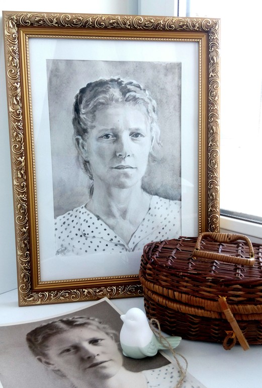 Недавно показывала потрет моей Клавы,какая она сейчас,а вот этот портрет был написан ей в подарок к 93-летию. Рисовала его по фото годов 60-х, качество у фото было так себе,конечно..но результатом бабуля довольна)сказала,что она всегда молода!