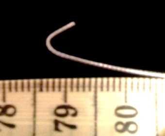2. Возьмите проволоку с покрытием. Проволоку без покрытия или леску согнутую случайно, вам не удастся выпрямить, нить будет смотреться не аккуратно. Проденьте в нее зажимную бусину «кримп», загните кончик нити на 5мм (Важно! Выполнение этого пункта обязательна для создания симметричного полукруга) сделайте крючок, как показано на рисунке.