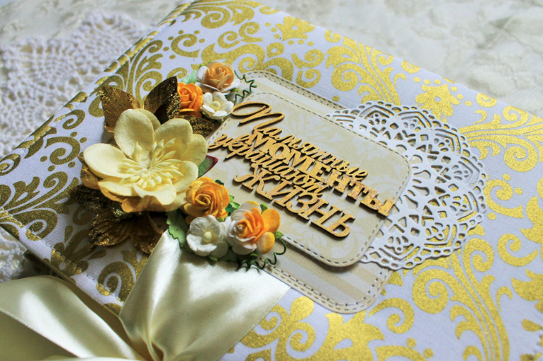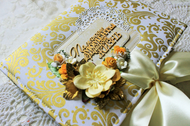 Обложка из картона обтянута американским хлопком с глиттером (она вся переливается на свету!) и проложена синтепоном для мягкости, закрывается на бант из атласной ленты.