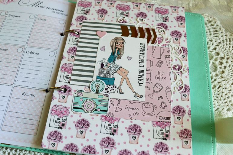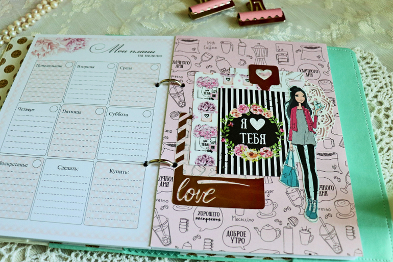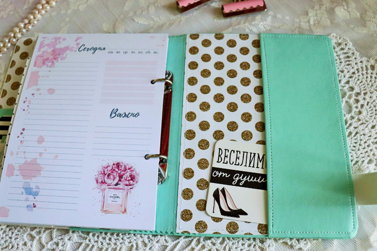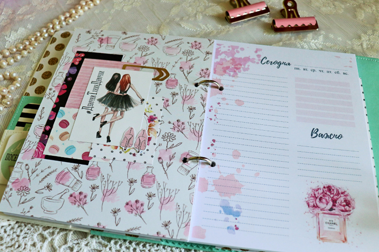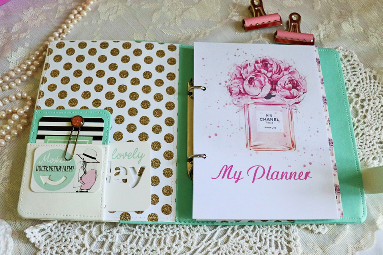 СкрапбукингПланер делался в Сп "Мой идеальный планер" в инстаграмм. Обложка выполнена из переплетного кожзама, страницы на кольцевом механизме, есть разделители, на форзацах кармашки также из кожзама, закрывается на магнитную кнопку